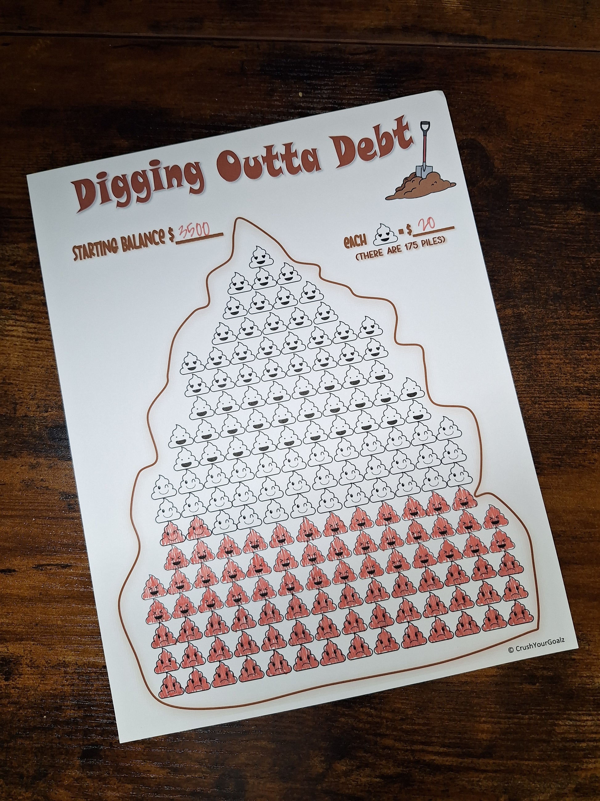 Digging out of Debt has never been this fun! Color in each poop emoji once you have paid down the debt for the respective amount. Start from the bottom, and work your way up; the emoji faces get better and better! Once all the "piles" are colored, YOUR DEBT IS PAID OFF!!!